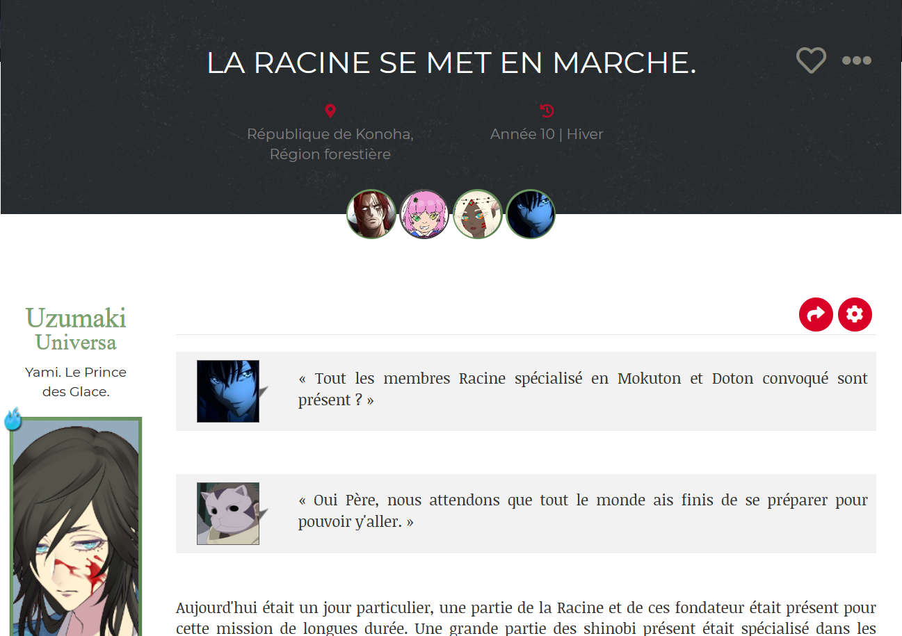 Naruto… C’est aussi de la politique ! Et oui, les meneurs doivent se servir des suiveurs pour gagner en reconnaissance. Ainsi, le conflit peut aussi bien être géographique que idéologique. Les membres sont ainsi les acteurs du jeu et les PNJ’s ne sont pas forcément utilisés. Les villages vivent sous des idéaux différents et ainsi, plus votre grade est élevé et plus vos décisions sont importantes au sein du RP.
