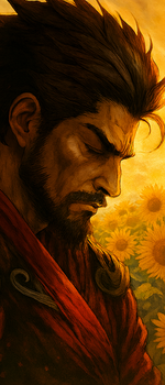 D’un geste méthodique il sortit un morceau de tissu et fit glisser la soie sur l’acier, essuyant le sang qui refusait de disparaître. Le froissement du tissu sur la lame résonna, bref, dans le silence retombant du champ. Aucun mot ne trahissait son étonnement : Byakuren n’était pas homme à se perdre en excuses. L’erreur restait une donnée, à intégrer et corriger. Il rengaina ensuite, la lame retrouvant son fourreau avec un claquement propre, sec.