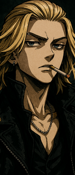 Manjiro impose sa présence dès qu’il apparaît, mais cette force brute se mêle à des traits d’une étonnante innocence, rappelant un garçon encore partiellement enfant. Sa carrure affirmée et ses cheveux blonds, longs et légèrement ondulés, encadrent un visage dur, aux traits volontairement fermes, accentués par des sourcils épais qui lui donnent une expression fermée et presque méprisante. Et pourtant, dans certains éclairs de son regard sombre, on devine une malice juvénile, un émerveillement fugitif ou un rire franc et inattendu, qui trahissent la part d’enfant encore vivante derrière la façade de défi.