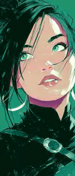 Son visage est fin, elle a les traits dur en temps normal, mais son visage s'illumine lorsqu'elle sourit. Ses cheveux son d'un noir profond, et ses yeux vert comme deux émeraudes,.